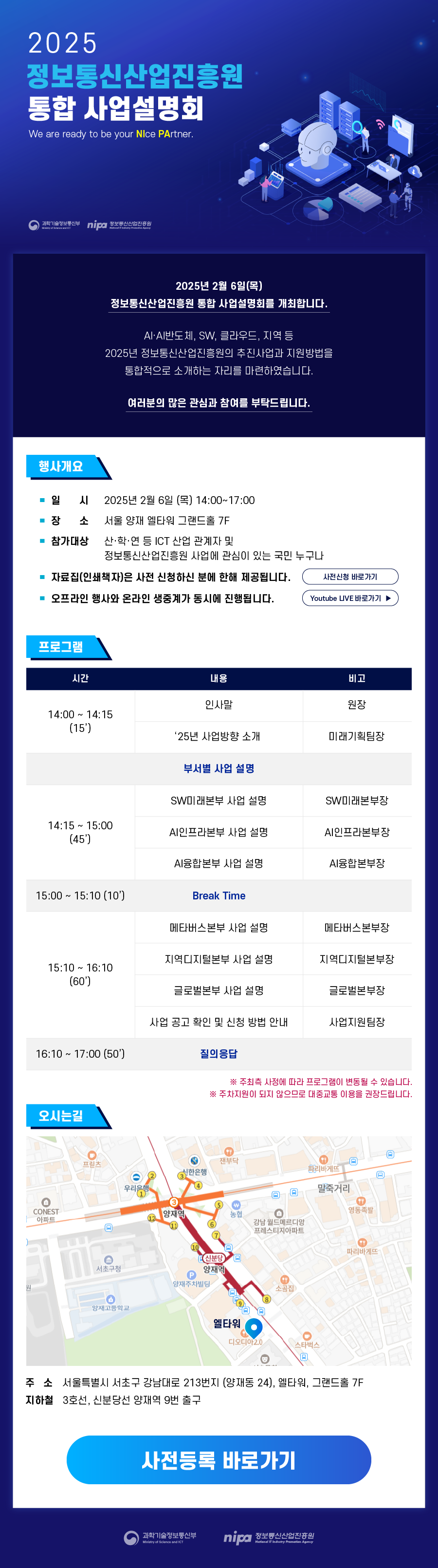 [행사소개] 2025정보통신산업진흥원 통합 사업설명회 관리자 2025-01-21 801 https://www.nipa.kr/home/2-1/15785 바로가기 >> 디지털미디어 콘텐츠 기획자 양성과정 참여자 모집 사용자 중심 디지털 콘텐츠 디자인 과정 참가자 모집